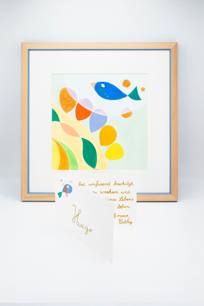 Each piece is an intuitive, hand-drawn artwork inspired by the child's name, created by Christine. She channels the colours, shapes and materials that resonate with each child's unique vibration.