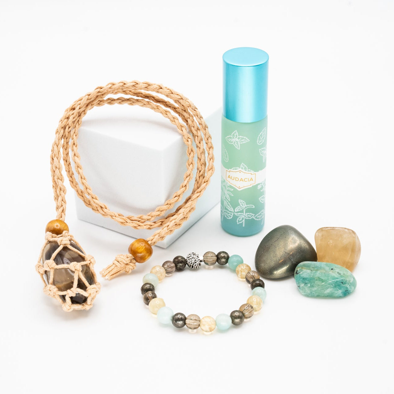 La gamme Audacia accompagne les enfants qui ressentent de l’angoisse face à l’école. Pensée pour transformer la peur en courage, elle aide à aborder chaque matin avec plus de sérénité. Grâce à l’énergie bienveillante de l’Amazonite, de la Pyrite, du Quartz fumé, de la Citrine.